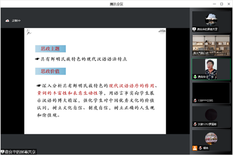 第一位授课教师费良华讲解的课程为《现代汉语2》,她在讲授部分对现代汉语语法特征的各个部分进行了准确而简要的讲解。在45分钟的讲课环节中,费良华运用理论与实际示例相结合的方法,通过媒体文段、自主造句发问,与员工形成积极的课堂互动,从语序和虚词两个方面进行深剖,充分展现了现代汉语民族性的不同表现形式。费良华将新的思政价值巧妙融入教学讲义,教学内容细致完整又不失趣味,她认真负责的教学态度和精炼的教学语言得到了评议组的一致肯定。