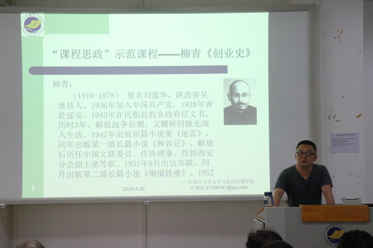 第二位授课教师叶澜涛副教授讲解的课程为《中国现当代文学》。他首先介绍了柳青的生平,再讲述其在农村的生活,通过特定文学作品的讲述,展现了柳青《创业史》的创作前身与准备工作,内容环环相扣,逻辑严谨,将《创作史》的人物关系与当代价值一一阐明。