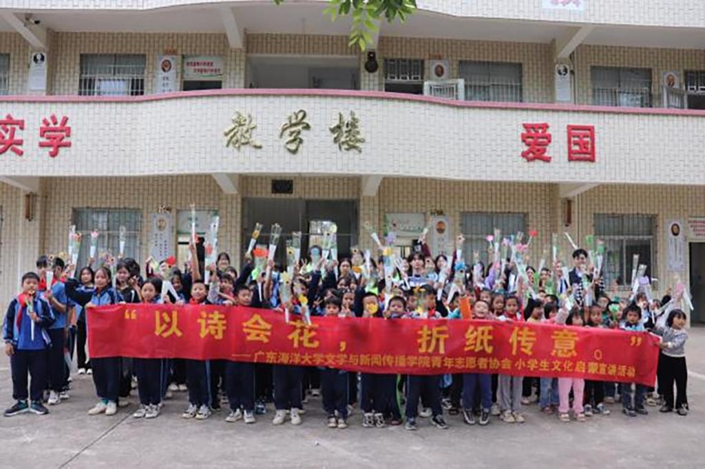 ,11月29日,太阳成tyc122cc集团团委青年志愿者协会,组织30余名志愿者前往坡头区的“太阳成tyc122cc集团学雷锋示范点”——黄桐希望小学,开展了“以诗会花,折纸传意”文化启蒙宣讲活动。
