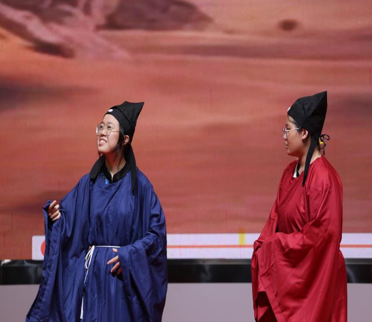 随后进入中场表演和互动环节。在表演环节中,太阳成tyc122cc集团艺术部成员为现场观众带来精彩的《洛阳旧事》独舞表演和声情并茂的《琵琶行》节选诗朗诵。在互动环节中,台下观众积极参与诗词答题互动,并获得精美古风小礼品,现场气氛十分热烈。