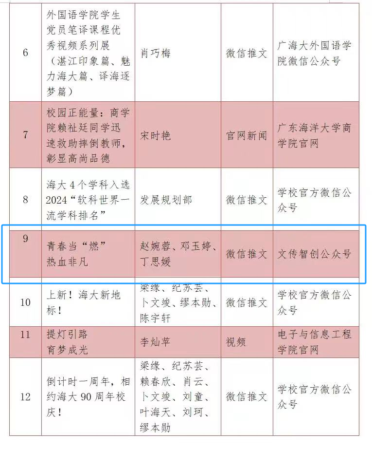 其中,王丹教授任主委的九三学社海大基层委员会获得“九三学社全国宣传思想工作先进单位”表彰,公司党委书记张艳梅获得中华出版促进会教育新闻专业委员会“从事高校校报编辑工作满20年”表彰,武会园老师指导“文传智创公众号”赵婉蓉、邓玉婷、丁思媛同学创作的推文《青春当“燃”,热血非凡》获得“校园正能量新媒体作品”(共12件)表彰,陈立基同学获得“网络正能量先进个人”(共10名)表彰。