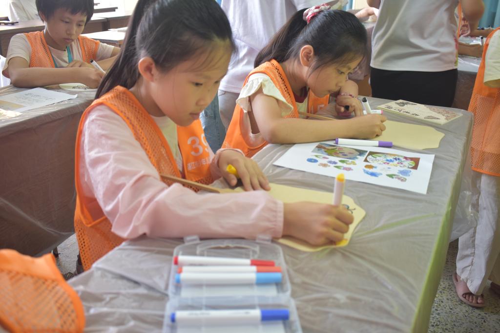 紧接着,在主讲人对团扇与香囊的历史渊源与文化内涵进行生动讲解后,孩子们满怀热情与期待开始了手工实践环节。志愿者们悉心指导孩子们绘制团扇、制作香囊。孩子们用画笔在空白的团扇上勾勒出充满想象的图画,随后在素色的香囊中仔细填充艾草、香花,创作出属于自己的作品。