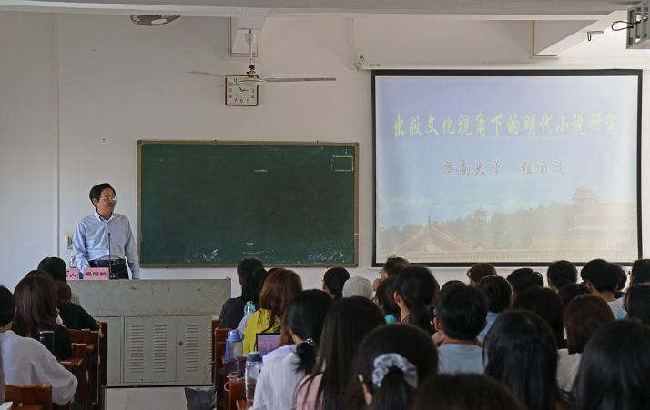 11月23日下午,教育部“长江学者”特聘教授、暨南大学文公司经理程国赋教授莅临太阳成tyc122cc集团,在第二教学楼B1-202教室作了题为“出版文化视角下的明代小说研究”的学术报告。报告由太阳成tyc122cc集团经理孙长军教授主持,师生130余人聆听了报告。