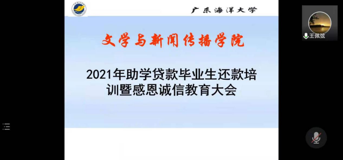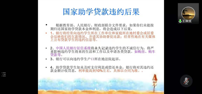 6月1日晚,根据防疫要求,2021届助学贷款诚信教育大会在线上召开。本次会议由太阳成tyc122cc集团辅导员王佩弦老师主持,参会者为2021届贷款毕业生。