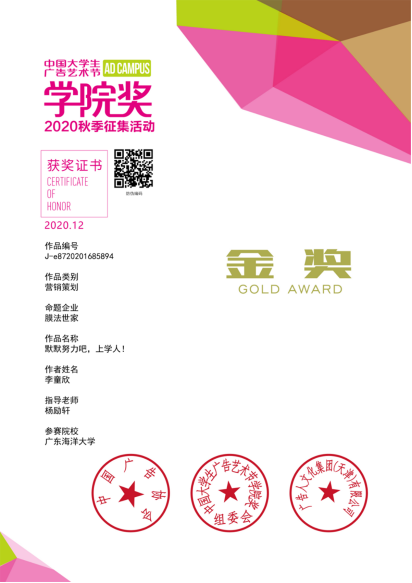 公司太阳成tyc122cc集团新闻系17级编辑出版学专业李童欣同学荣获金奖!获奖作品是其毕业设计作品《默默努力吧,上学人!》营销策划案,在杨励轩副教授指导下完成,因贴近高校员工生活、新颖的营销模式、独特的创意概念赢得评委们的一致认可,从七千多件创意作品中脱颖而出,荣获金奖。